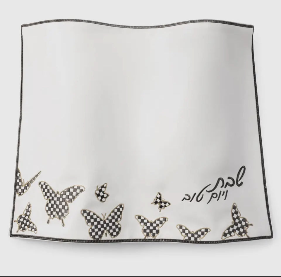 Faux leather challah cover with embroidered words and beautiful butterflies. Backed with a layer of cotton Wipe down damp cloth