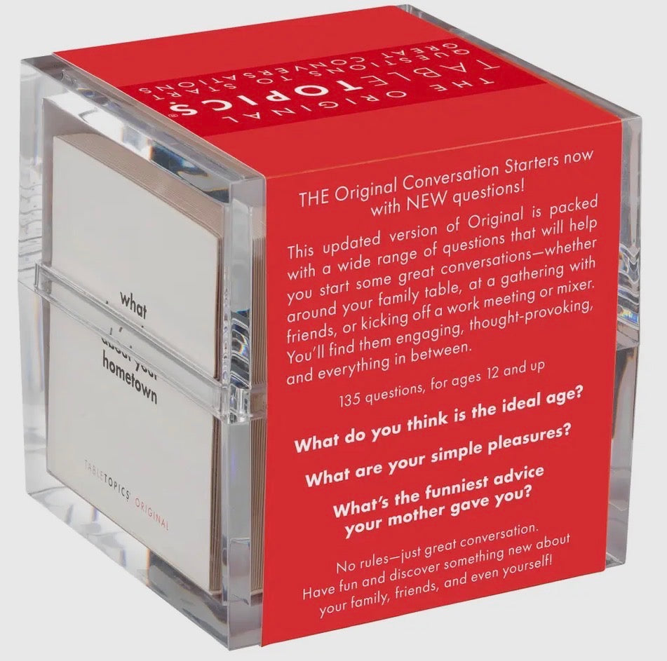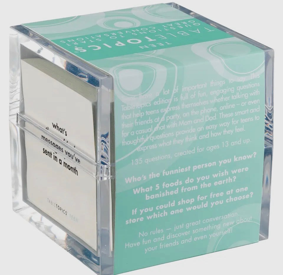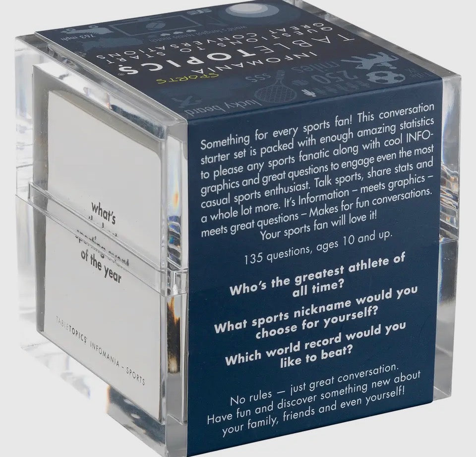 Conversation starters, but make it fun! 135 question cards in a 4" x 4"x 4" clear, acrylic cube. Original, Teen and Sports versions.